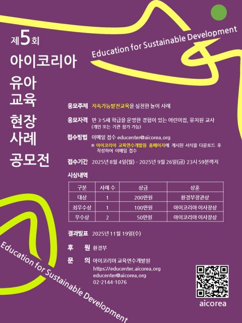 아이코리아(이사장 김태련)가 8월 4일(월)부터 9월 26일(금)까지 지속가능발전교육(ESD)을 주제로 ‘제5회 아이코리아 유아교육 현장사례 공모전’을 개최하고 작품을 접수한다.